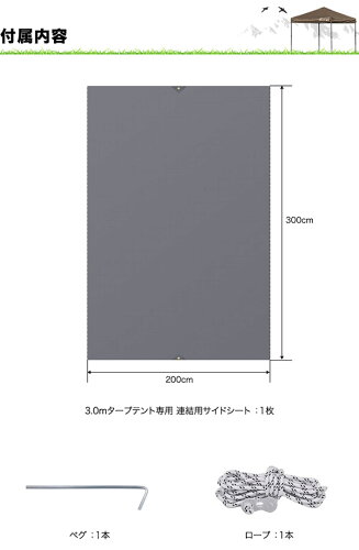 ※[店舗管理用 URL]a11338※[品番]【a11338】 ブランド: フィールドア(FIELDOOR) サイズ: (約)200cm×300cm 材質:ポリエステル カラー: ダークグレー 耐水圧: 2,227mm UV遮蔽率: 98.8% 付属品: ・3.0m×3.0m タープテント連結用サイドシート×1枚 ・ロープ×1本 ・ペグ×1本 特記事項: こちらの商品にはタープテント本体は付属いたしません。