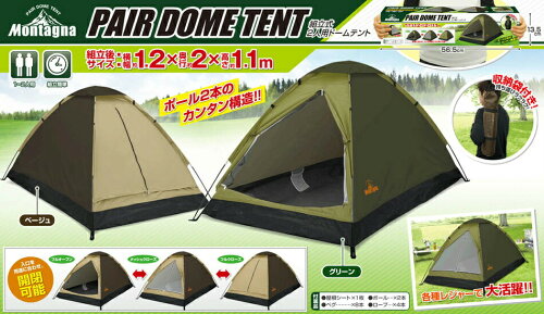 組立式2人用ドームテント 収納袋付テント ドームテント 2人用 スポーツ アウトドア テント本体 グリーン コンパクト Montagna モンターナ ■商品詳細ポール2本の簡単構造なので1人でも短時間で設営できます。