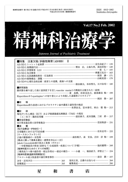 内容紹介 精神科治療学 Vol.17 No.2 Feb. 2002 【特集】注意欠陥/多動性障害(AD/HD)(2) AD/HDとトゥレット症候群 …金生由紀子 AD/HDと高機能PDD …栗田広、立森久照、長田洋和 AD/HDと学習障害(LD) …原仁 AD/HDと気分障害 …齊藤万比古 AD/HDと反抗挑戦性障害・行為障害 …原田謙 AD/HDの薬物療法:課題 …山崎晃資 AD/HDの心理社会的治療:教育との連携、教師への支援 …清水康夫、本田秀夫、日戸由刈 【研究報告】 躁状態を繰り返した後に意欲低下を呈しvascular maniaとの関連を示唆された一症例 …姜昌勲、杉原克比古、渡部雄治、他 Risperidoneからquetiapineへの切り替えにより出現した退薬性ジスキネジア …岡田俊 【短報】 Risperidone投与患者におけるプロラクチン血中濃度と副作用の検討 …米澤治文、岩本泰行、西山聡、他 【総説】 気けいれん療法(ECT)および経頭蓋磁気刺激法(TMS)の現在[1]ECT:臨床応用編 …前田典子、武井茂樹、三村將 【学会印象記】 ST普及協会第6回学術集会 …岩田和彦 【連載】 〔私の治療法‐PTSD(5)‐〕 日常臨床におけるPTSD治療 …岩井圭司 〔ケースカンファランス〕 17歳の緊張病の一女性例 …高松桃子、高宜良、古田淳、他 〔原点に帰って原典を読む—症例を中心に—(2)〕 Jakob‐Creutzfeldt病の原点と原典(その2) —中枢神経系の特有(奇妙な?)な病巣性一疾患について(予報)— …池村義明 〔精神科医のためのくすりの時間〕 三環系抗うつ薬の副作用・相互作用(4) —最近の報告— …小瀧一、福田直子、伊賀立二 〔精神科医療過誤判例解説(10)〕 アルコール症入院患者の暴行障害事件 …深谷翼