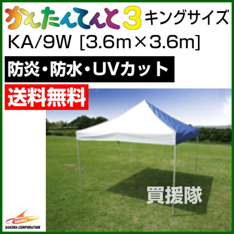 (認定No.F-21285) 仕様 品名 かんたんてんと3 キングサイズ 品番 KA/9W メーカー 株式会社さくら フレーム スチール&アルミ複合フレーム 標準カラー 白、青/白、赤/白、緑/白 テントサイズ 3.6m×3.6m 有効軒高 194cm〜225cm 全高 344cm〜375cm 収納サイズ 24cm×24cm×186cm 柱本数 4本 総重量 37.6kg 標準付属品 取扱説明書、フレーム収納バッグ、天幕収納袋、ロープ×4本(φ6×3,000mm程)、ペグ×8本( φ6×280mm程)、ペグ収納袋、六角レンチ×2本、ワイヤーブレス1式 備考 手に優しいソフトエッジ加工、肌に優しいUVカット率99%、安心の防炎製品 ※2色もしくは4色カラーの天幕は、ポリエステル生地特性および防災加工処理剤により、色の移行(色うつり)が発生する可能性がありますが、品質に問題ございません。