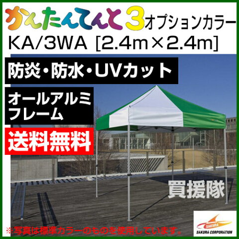 仕様 品名 かんたんてんと3 オールアルミフレーム 品番 KA/3WA メーカー 株式会社さくら フレーム オールアルミフレーム オプションカラー 深緑、黄緑、紺、水色、OD色 テントサイズ 2.4m×2.4m 有効軒高 162cm〜178cm 全高 277cm〜293cm 収納サイズ 24cm×24cm×127cm 柱本数 4本 天幕重量 3.0kg 収納バック重量 1.2kg フレーム重量 20.0kg 総重量 24.2kg 標準付属品 本体収納バッグ、天幕収納袋、ロープ×4、ペグ×4(直径8mm×280mm)※1、六角レンチ×2、取扱説明書 備考 手に優しいソフトエッジ加工、肌に優しいUVカット率99%、安心の防炎製品 ※1 KA/2WA・5WA・8WAは6本です。